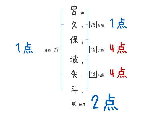 外運![]() | 宮久保波矢斗さんの外運は22画の1つ星!努力することが苦手ないっぽう手先が器用。芸術性にも優れる。 生活面を象徴する運勢です。外部から受ける影響力を表し、結婚運、家庭運や職場、環境への順応性を表します。 |