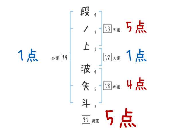外運![]() | 段ノ上波矢斗さんの外運は19画の1つ星!優れた才能を持ちますが、協調性が足りないことも。周りの人と協力する事を意識しましょう。 生活面を象徴する運勢です。外部から受ける影響力を表し、結婚運、家庭運や職場、環境への順応性を表します。 |