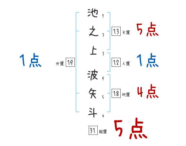 外運![]() | 池之上波矢斗さんの外運は19画の1つ星!優れた才能を持ちますが、協調性が足りないことも。周りの人と協力する事を意識しましょう。 生活面を象徴する運勢です。外部から受ける影響力を表し、結婚運、家庭運や職場、環境への順応性を表します。 |