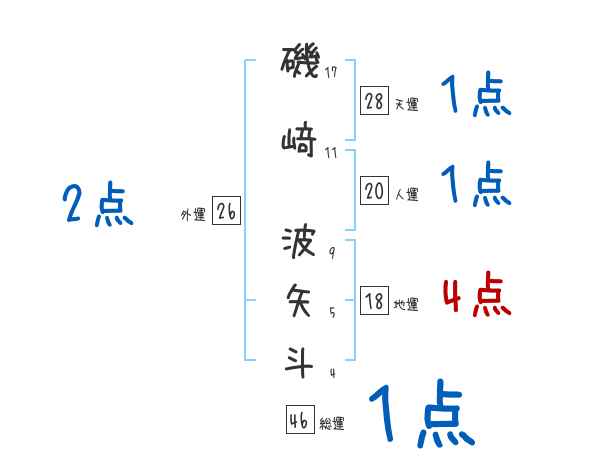 天運![]() | 磯﨑波矢斗さんの天運は28画の1つ星!家庭環境に注意。スポーツで活躍できる能力があるかも。 家系が持つ宿命的な運勢を表します。祖先から受け継いだ苗字ですので自分の力が及びません。家柄を象徴します。 |