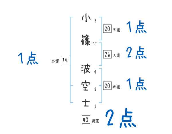 外運![]() | 小篠波空士さんの外運は14画の1つ星!人に対して優しいがストレスを溜め込みがち。人間関係のトラブルを避けるよう気をつけましょう。 生活面を象徴する運勢です。外部から受ける影響力を表し、結婚運、家庭運や職場、環境への順応性を表します。 |