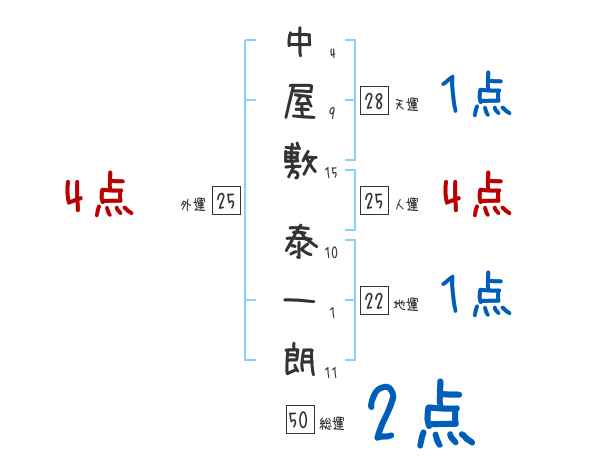 人運![]() | 中屋敷泰一朗さんの人運は25画の4つ星!個性があり才能があふれる。強運の持ち主で発展する。 性格や才能などを表す2番目に重要な運勢です。人間関係や協調性、社会的な成功に影響します。主に20歳から50歳ぐらいまでの中年期の運勢を表します。 |