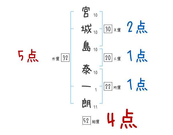 外運![]() | 宮城島泰一朗さんの外運は32画の5つ星!柔軟性があり成功する。チャンスが多く金運が良い。 生活面を象徴する運勢です。外部から受ける影響力を表し、結婚運、家庭運や職場、環境への順応性を表します。 |