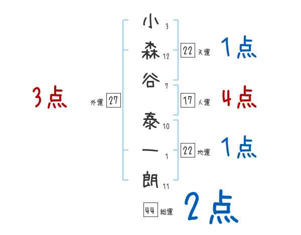 天運![]() | 小森谷泰一朗さんの天運は22画の1つ星!努力することが苦手ないっぽう手先が器用。芸術性にも優れる。 家系が持つ宿命的な運勢を表します。祖先から受け継いだ苗字ですので自分の力が及びません。家柄を象徴します。 |