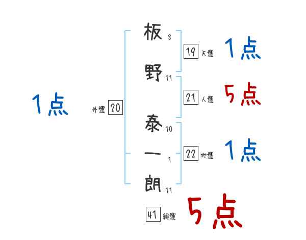 人運![]() | 板野泰一朗さんの人運は21画の5つ星!統率力がある。独立し成功する。名誉を手に入れる。 性格や才能などを表す2番目に重要な運勢です。人間関係や協調性、社会的な成功に影響します。主に20歳から50歳ぐらいまでの中年期の運勢を表します。 |