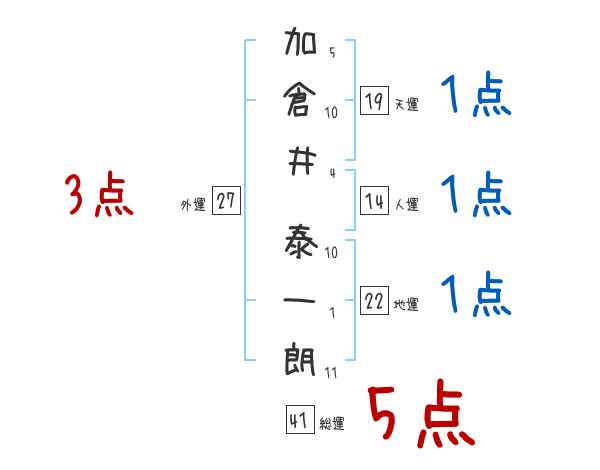 総運![]() | 加倉井泰一朗さんの総運は41画の5つ星!大志を抱き、目標に向かって実力を発揮し達成する。温和な性格。 あなたの人生を表す1番重要な運勢です。生涯を通じて影響する総合運となり、主に50歳以降の晩年期に影響を及ぼします。 |