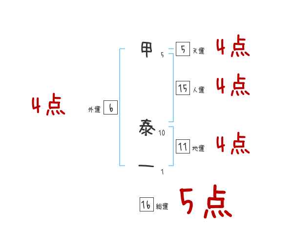 天運![]() | 甲泰一さんの天運は5画の4つ星!健康で安泰。協調性に優れ、財産に恵まれる。 家系が持つ宿命的な運勢を表します。祖先から受け継いだ苗字ですので自分の力が及びません。家柄を象徴します。 |