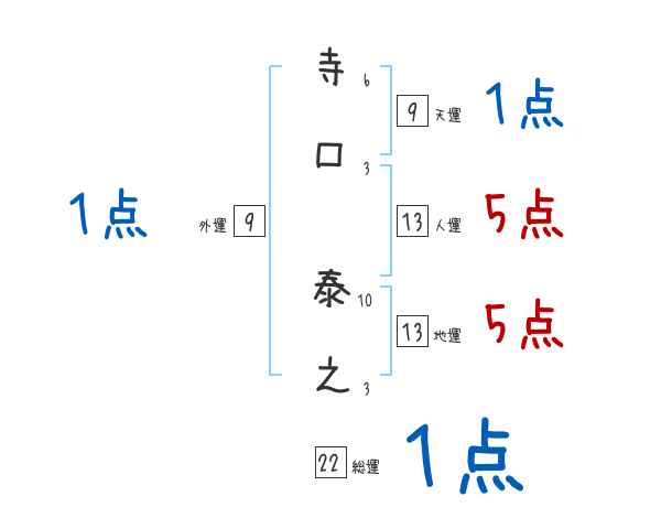 天運![]() | 寺口泰之さんの天運は9画の1つ星!消極的で才能を発揮することが苦手なことも。周りの意見に耳を傾けましょう。 家系が持つ宿命的な運勢を表します。祖先から受け継いだ苗字ですので自分の力が及びません。家柄を象徴します。 |