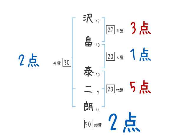天運![]() | 沢畠泰二朗さんの天運は27画の3つ星!頭脳明晰だが強情で摩擦が多い傾向。孤立に注意。 家系が持つ宿命的な運勢を表します。祖先から受け継いだ苗字ですので自分の力が及びません。家柄を象徴します。 |