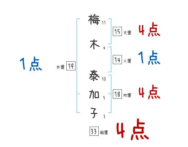 外運![]() | 梅木泰加子さんの外運は19画の1つ星!優れた才能を持ちますが、協調性が足りないことも。周りの人と協力する事を意識しましょう。 生活面を象徴する運勢です。外部から受ける影響力を表し、結婚運、家庭運や職場、環境への順応性を表します。 |