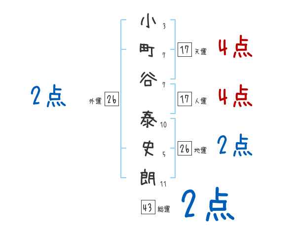 天運![]() | 小町谷泰史朗さんの天運は17画の4つ星!積極的な行動力。地位を気づき財産を手に入れる。純粋な心と直感力。 家系が持つ宿命的な運勢を表します。祖先から受け継いだ苗字ですので自分の力が及びません。家柄を象徴します。 |