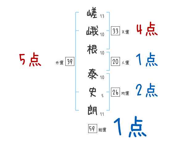 外運![]() | 嵯峨根泰史朗さんの外運は39画の5つ星!社交性に優れ人望が厚い。人の上に立ち成功する。 生活面を象徴する運勢です。外部から受ける影響力を表し、結婚運、家庭運や職場、環境への順応性を表します。 |