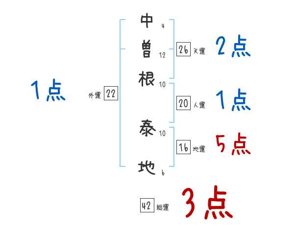 天運![]() | 中曽根泰地さんの天運は26画の2つ星!波瀾万丈かも。信頼できる人を大事にしましょう。 家系が持つ宿命的な運勢を表します。祖先から受け継いだ苗字ですので自分の力が及びません。家柄を象徴します。 |
