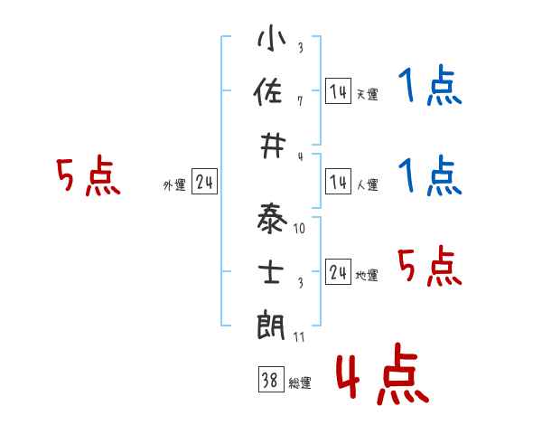外運![]() | 小佐井泰士朗さんの外運は24画の5つ星!家庭運が良く順調な人生。金運にも恵まれる。 生活面を象徴する運勢です。外部から受ける影響力を表し、結婚運、家庭運や職場、環境への順応性を表します。 |