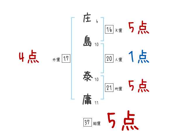 外運![]() | 庄島泰庸さんの外運は17画の4つ星!積極的な行動力。地位を気づき財産を手に入れる。純粋な心と直感力。 生活面を象徴する運勢です。外部から受ける影響力を表し、結婚運、家庭運や職場、環境への順応性を表します。 |