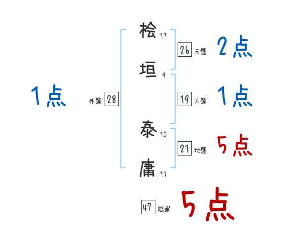 外運![]() | 桧垣泰庸さんの外運は28画の1つ星!家庭環境に注意。スポーツで活躍できる能力があるかも。 生活面を象徴する運勢です。外部から受ける影響力を表し、結婚運、家庭運や職場、環境への順応性を表します。 |