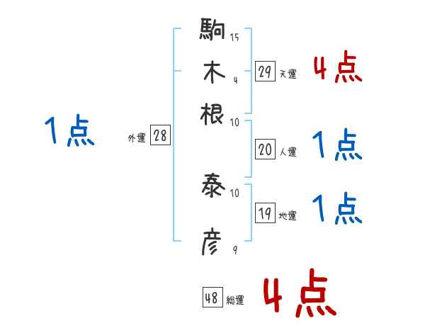 外運![]() | 駒木根泰彦さんの外運は28画の1つ星!家庭環境に注意。スポーツで活躍できる能力があるかも。 生活面を象徴する運勢です。外部から受ける影響力を表し、結婚運、家庭運や職場、環境への順応性を表します。 |