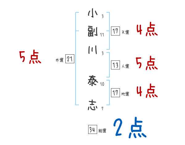 総運![]() | 小副川泰志さんの総運は34画の2つ星!独創性に優れるが、自尊心が強く災難に注意しましょう。 あなたの人生を表す1番重要な運勢です。生涯を通じて影響する総合運となり、主に50歳以降の晩年期に影響を及ぼします。 |