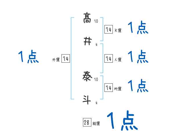 天運![]() | 髙井泰斗さんの天運は14画の1つ星!人に対して優しいがストレスを溜め込みがち。人間関係のトラブルを避けるよう気をつけましょう。 家系が持つ宿命的な運勢を表します。祖先から受け継いだ苗字ですので自分の力が及びません。家柄を象徴します。 |