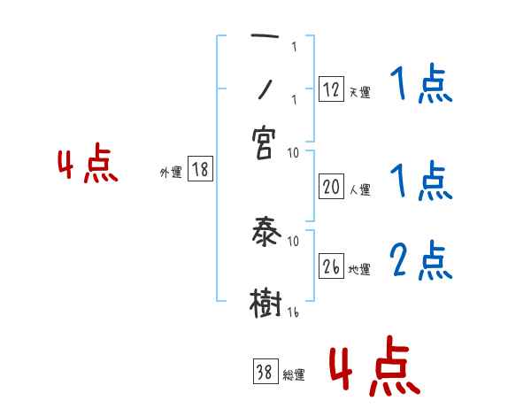 外運![]() | 一ノ宮泰樹さんの外運は18画の4つ星!情熱的で剛気。忍耐力があり信頼される。 生活面を象徴する運勢です。外部から受ける影響力を表し、結婚運、家庭運や職場、環境への順応性を表します。 |