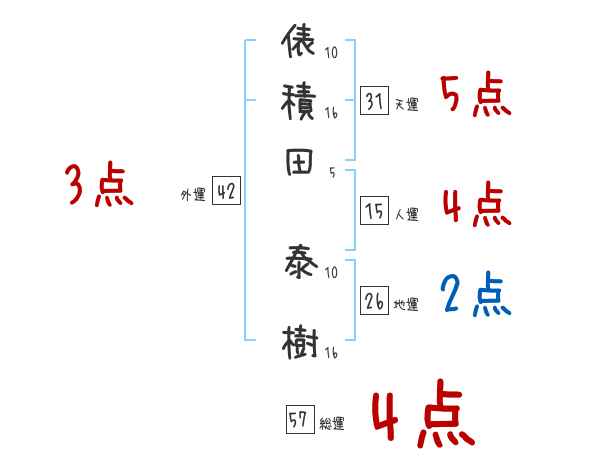 外運![]() | 俵積田泰樹さんの外運は42画の3つ星!病気に注意。多芸であるが消極的でおとなしい。 生活面を象徴する運勢です。外部から受ける影響力を表し、結婚運、家庭運や職場、環境への順応性を表します。 |
