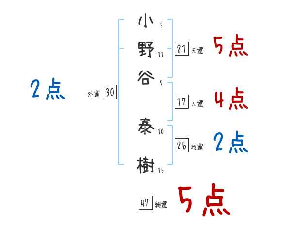 外運![]() | 小野谷泰樹さんの外運は30画の2つ星!浮き沈みの激しさに注意しましょう。 生活面を象徴する運勢です。外部から受ける影響力を表し、結婚運、家庭運や職場、環境への順応性を表します。 |