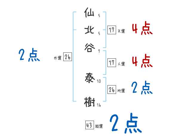 天運![]() | 仙北谷泰樹さんの天運は17画の4つ星!積極的な行動力。地位を気づき財産を手に入れる。純粋な心と直感力。 家系が持つ宿命的な運勢を表します。祖先から受け継いだ苗字ですので自分の力が及びません。家柄を象徴します。 |