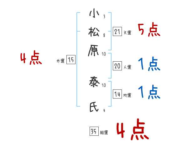 総運![]() | 小松原泰氏さんの総運は35画の4つ星!温厚な性格で感受性が高い。穏和な性格で人望が厚い。 あなたの人生を表す1番重要な運勢です。生涯を通じて影響する総合運となり、主に50歳以降の晩年期に影響を及ぼします。 |