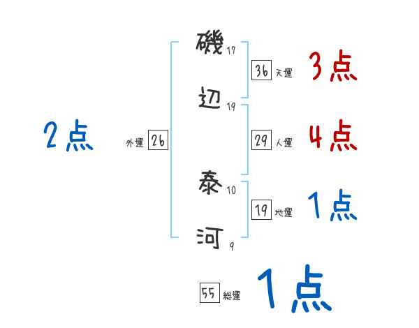 外運![]() | 磯辺泰河さんの外運は26画の2つ星!波瀾万丈かも。信頼できる人を大事にしましょう。 生活面を象徴する運勢です。外部から受ける影響力を表し、結婚運、家庭運や職場、環境への順応性を表します。 |
