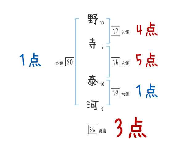 天運![]() | 野寺泰河さんの天運は17画の4つ星!積極的な行動力。地位を気づき財産を手に入れる。純粋な心と直感力。 家系が持つ宿命的な運勢を表します。祖先から受け継いだ苗字ですので自分の力が及びません。家柄を象徴します。 |