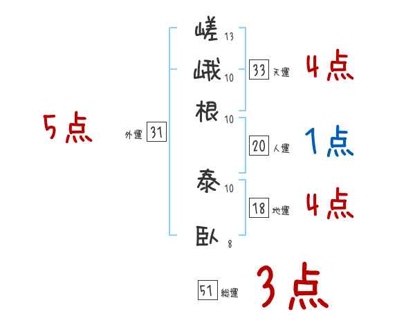 総運![]() | 嵯峨根泰臥さんの総運は51画の3つ星!変化が激しく、危険に注意。堅実な性格。 あなたの人生を表す1番重要な運勢です。生涯を通じて影響する総合運となり、主に50歳以降の晩年期に影響を及ぼします。 |