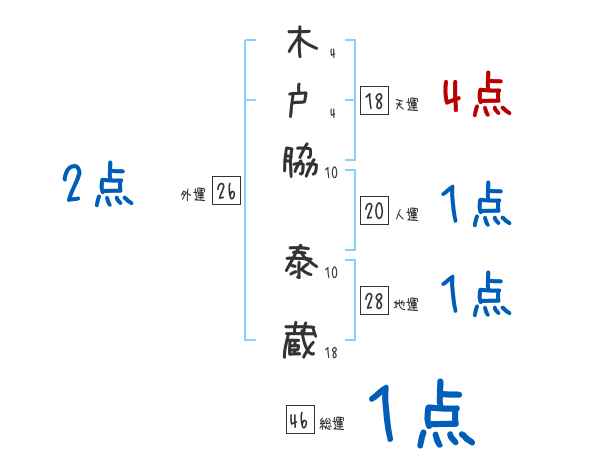 総運![]() | 木戸脇泰蔵さんの総運は46画の1つ星!迷走することが多く苦労するかも。目先のことにとらわれないように。 あなたの人生を表す1番重要な運勢です。生涯を通じて影響する総合運となり、主に50歳以降の晩年期に影響を及ぼします。 |