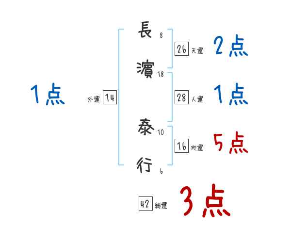 人運![]() | 長濵泰行さんの人運は28画の1つ星!家庭環境に注意。スポーツで活躍できる能力があるかも。 性格や才能などを表す2番目に重要な運勢です。人間関係や協調性、社会的な成功に影響します。主に20歳から50歳ぐらいまでの中年期の運勢を表します。 |