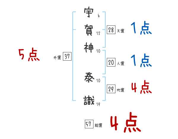 天運![]() | 宇賀神泰識さんの天運は28画の1つ星!家庭環境に注意。スポーツで活躍できる能力があるかも。 家系が持つ宿命的な運勢を表します。祖先から受け継いだ苗字ですので自分の力が及びません。家柄を象徴します。 |