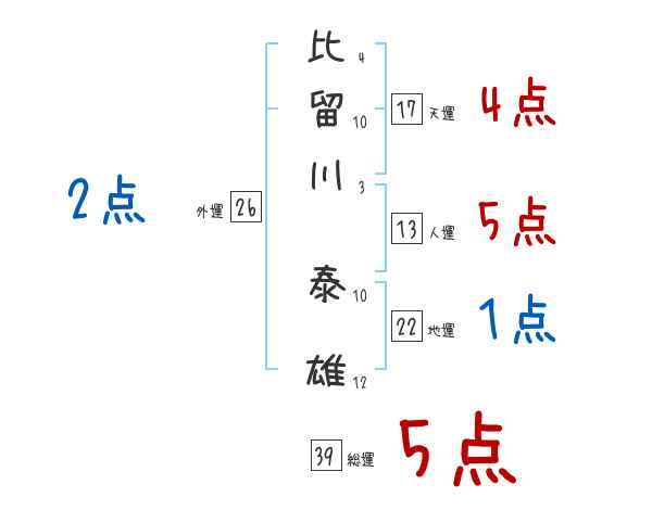 総運![]() | 比留川泰雄さんの総運は39画の5つ星!社交性に優れ人望が厚い。人の上に立ち成功する。 あなたの人生を表す1番重要な運勢です。生涯を通じて影響する総合運となり、主に50歳以降の晩年期に影響を及ぼします。 |