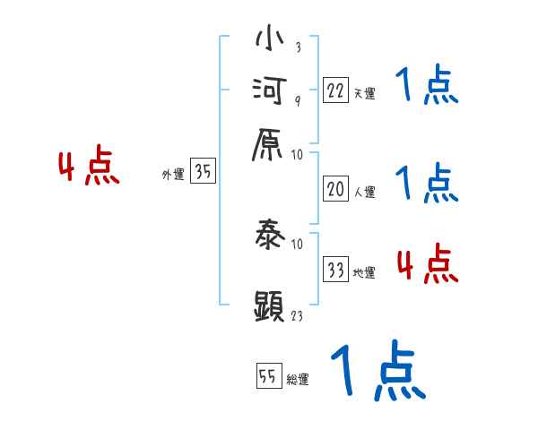 外運![]() | 小河原泰顕さんの外運は35画の4つ星!温厚な性格で感受性が高い。穏和な性格で人望が厚い。 生活面を象徴する運勢です。外部から受ける影響力を表し、結婚運、家庭運や職場、環境への順応性を表します。 |