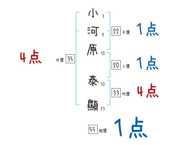 | 天運  | 小河原泰顯さんの天運は22画の1つ星!努力することが苦手ないっぽう手先が器用。芸術性にも優れる。家系が持つ宿命的な運勢を表します。祖先から受け継いだ苗字ですので自分の力が及びません。家柄を象徴します。 |