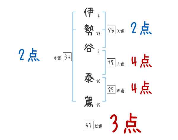 天運![]() | 伊勢谷泰駕さんの天運は26画の2つ星!波瀾万丈かも。信頼できる人を大事にしましょう。 家系が持つ宿命的な運勢を表します。祖先から受け継いだ苗字ですので自分の力が及びません。家柄を象徴します。 |