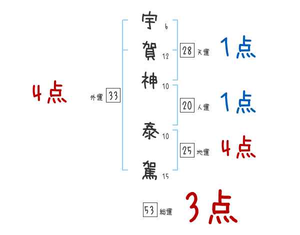 天運![]() | 宇賀神泰駕さんの天運は28画の1つ星!家庭環境に注意。スポーツで活躍できる能力があるかも。 家系が持つ宿命的な運勢を表します。祖先から受け継いだ苗字ですので自分の力が及びません。家柄を象徴します。 |