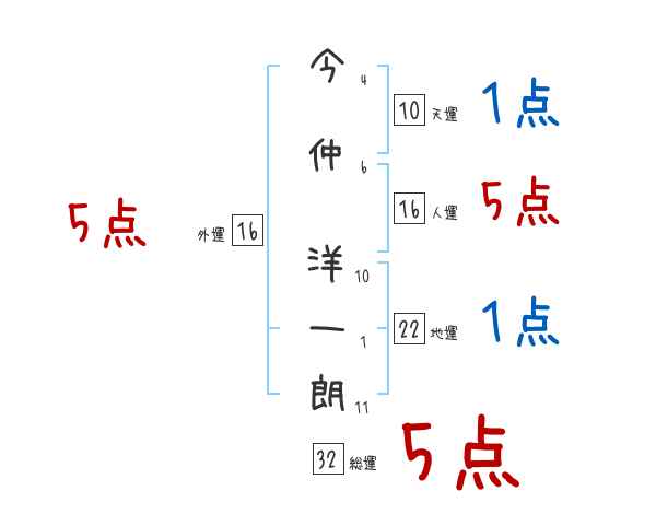 人運![]() | 今仲洋一朗さんの人運は16画の5つ星!人望が厚く大きく発展する。逆転成功が見える。 性格や才能などを表す2番目に重要な運勢です。人間関係や協調性、社会的な成功に影響します。主に20歳から50歳ぐらいまでの中年期の運勢を表します。 |
