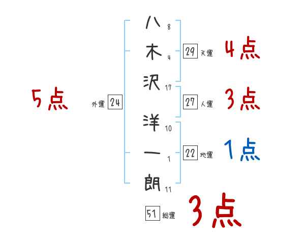 天運![]() | 八木沢洋一朗さんの天運は29画の4つ星!完全主義で才能がある。厳格な心の持ち主。 家系が持つ宿命的な運勢を表します。祖先から受け継いだ苗字ですので自分の力が及びません。家柄を象徴します。 |