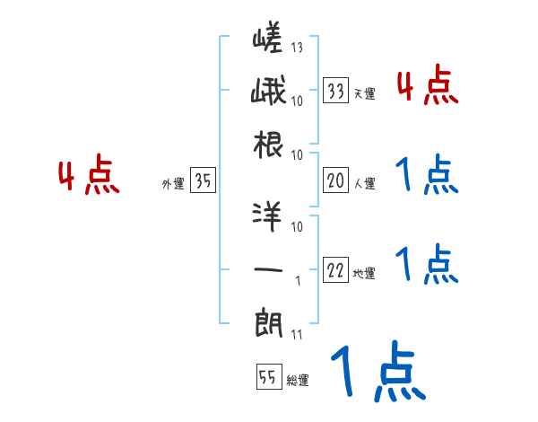 外運![]() | 嵯峨根洋一朗さんの外運は35画の4つ星!温厚な性格で感受性が高い。穏和な性格で人望が厚い。 生活面を象徴する運勢です。外部から受ける影響力を表し、結婚運、家庭運や職場、環境への順応性を表します。 |