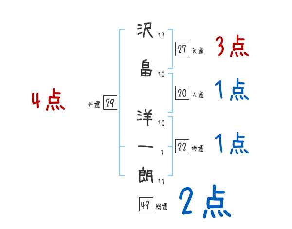 外運![]() | 沢畠洋一朗さんの外運は29画の4つ星!完全主義で才能がある。厳格な心の持ち主。 生活面を象徴する運勢です。外部から受ける影響力を表し、結婚運、家庭運や職場、環境への順応性を表します。 |