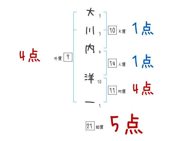 外運![]() | 大川内洋一さんの外運は7画の4つ星!強い意志や信念を持ち独立心が強い。自立する。 生活面を象徴する運勢です。外部から受ける影響力を表し、結婚運、家庭運や職場、環境への順応性を表します。 |