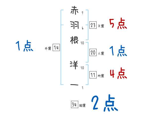 天運![]() | 赤羽根洋一さんの天運は23画の5つ星!想像力に優れ活力がある。一代で成功し名誉を手に入れる。 家系が持つ宿命的な運勢を表します。祖先から受け継いだ苗字ですので自分の力が及びません。家柄を象徴します。 |