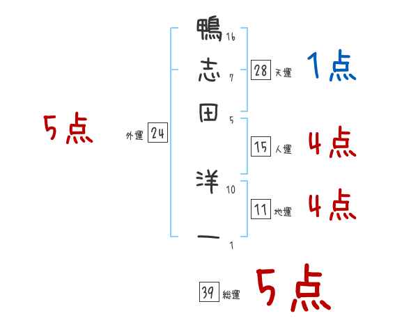 総運![]() | 鴨志田洋一さんの総運は39画の5つ星!社交性に優れ人望が厚い。人の上に立ち成功する。 あなたの人生を表す1番重要な運勢です。生涯を通じて影響する総合運となり、主に50歳以降の晩年期に影響を及ぼします。 |