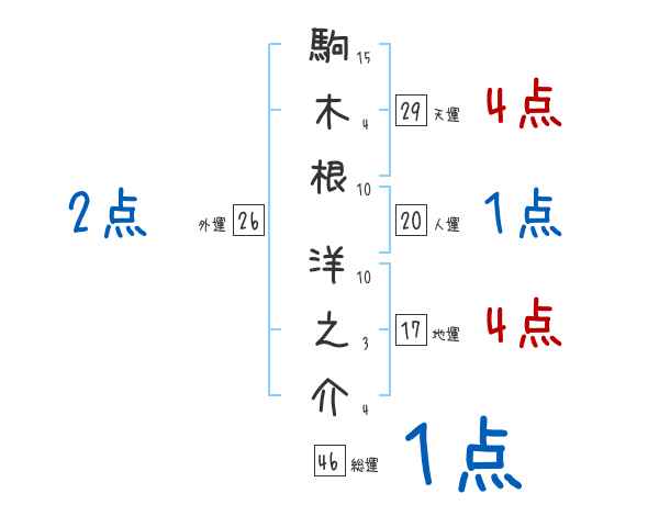 総運![]() | 駒木根洋之介さんの総運は46画の1つ星!迷走することが多く苦労するかも。目先のことにとらわれないように。 あなたの人生を表す1番重要な運勢です。生涯を通じて影響する総合運となり、主に50歳以降の晩年期に影響を及ぼします。 |