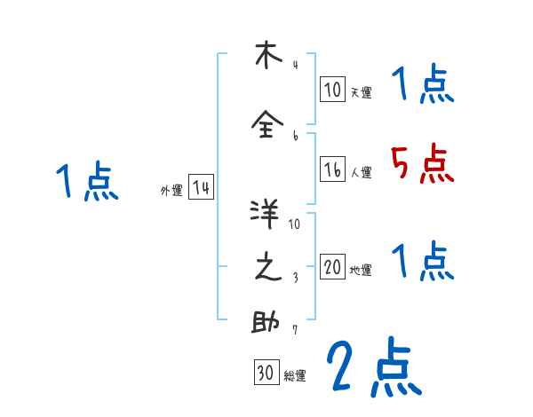 | 外運  | 木全洋之助さんの外運は14画の1つ星!人に対して優しいがストレスを溜め込みがち。人間関係のトラブルを避けるよう気をつけましょう。生活面を象徴する運勢です。外部から受ける影響力を表し、結婚運、家庭運や職場、環境への順応性を表します。 |