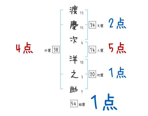 外運![]() | 渡慶次洋之助さんの外運は38画の4つ星!温厚な性格で技術的な才能を発揮する。職人的な仕事に向いている。 生活面を象徴する運勢です。外部から受ける影響力を表し、結婚運、家庭運や職場、環境への順応性を表します。 |