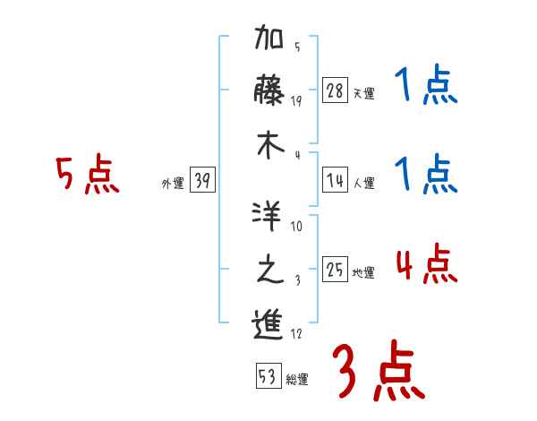 総運![]() | 加藤木洋之進さんの総運は53画の3つ星!やや見栄っ張りで虚栄心がある。散財に注意。 あなたの人生を表す1番重要な運勢です。生涯を通じて影響する総合運となり、主に50歳以降の晩年期に影響を及ぼします。 |
